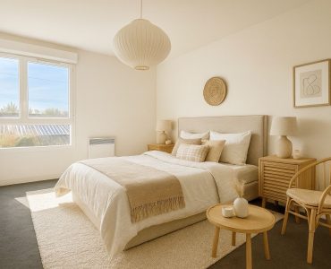 D’une surface d’environ 90 m², elle accueille dès l’entrée un espace avec placards, un WC indépendant et une pièce de vie de près de 28 m². Baignée de lumière, celle-ci réunit une cuisine ouverte conviviale et un séjour donnant directement sur un jardin privatif. Terrasse généreuse, coin pelouse et atmosphère intime : un véritable prolongement de l’espace intérieur.