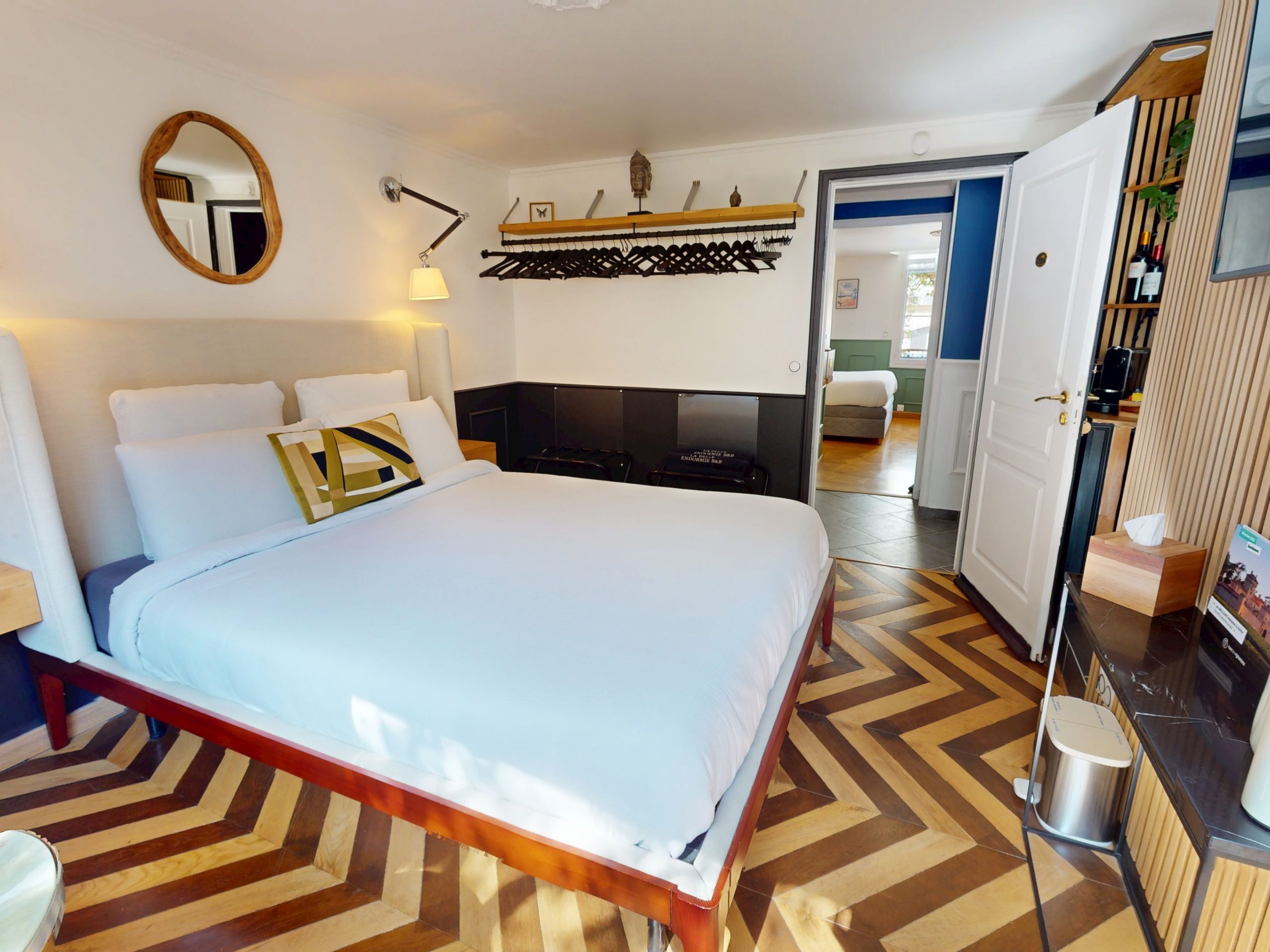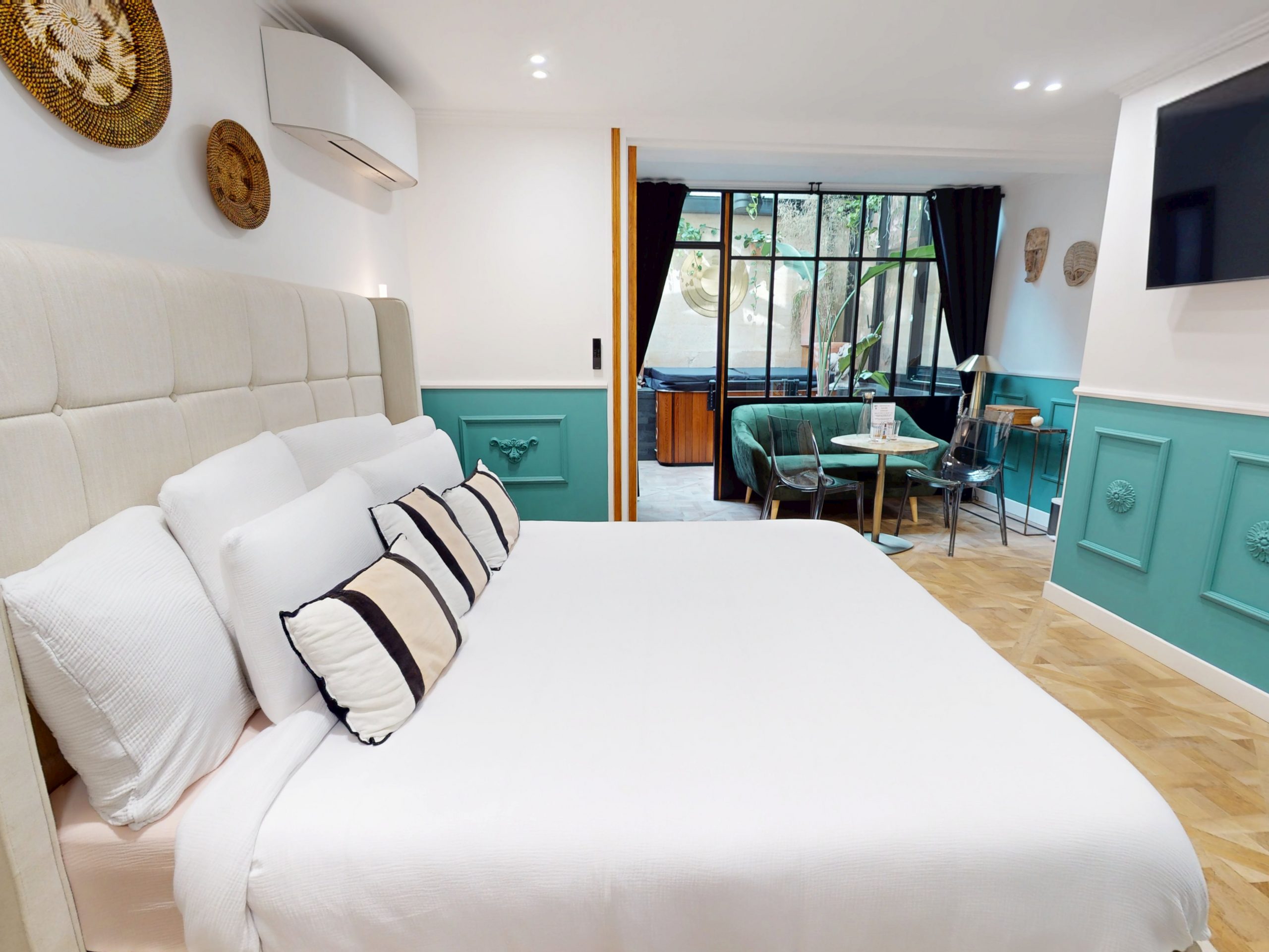 L’une des chambres bénéficie d’un atout rare en centre-ville : une cour couverte privative avec jacuzzi, véritable havre de détente.